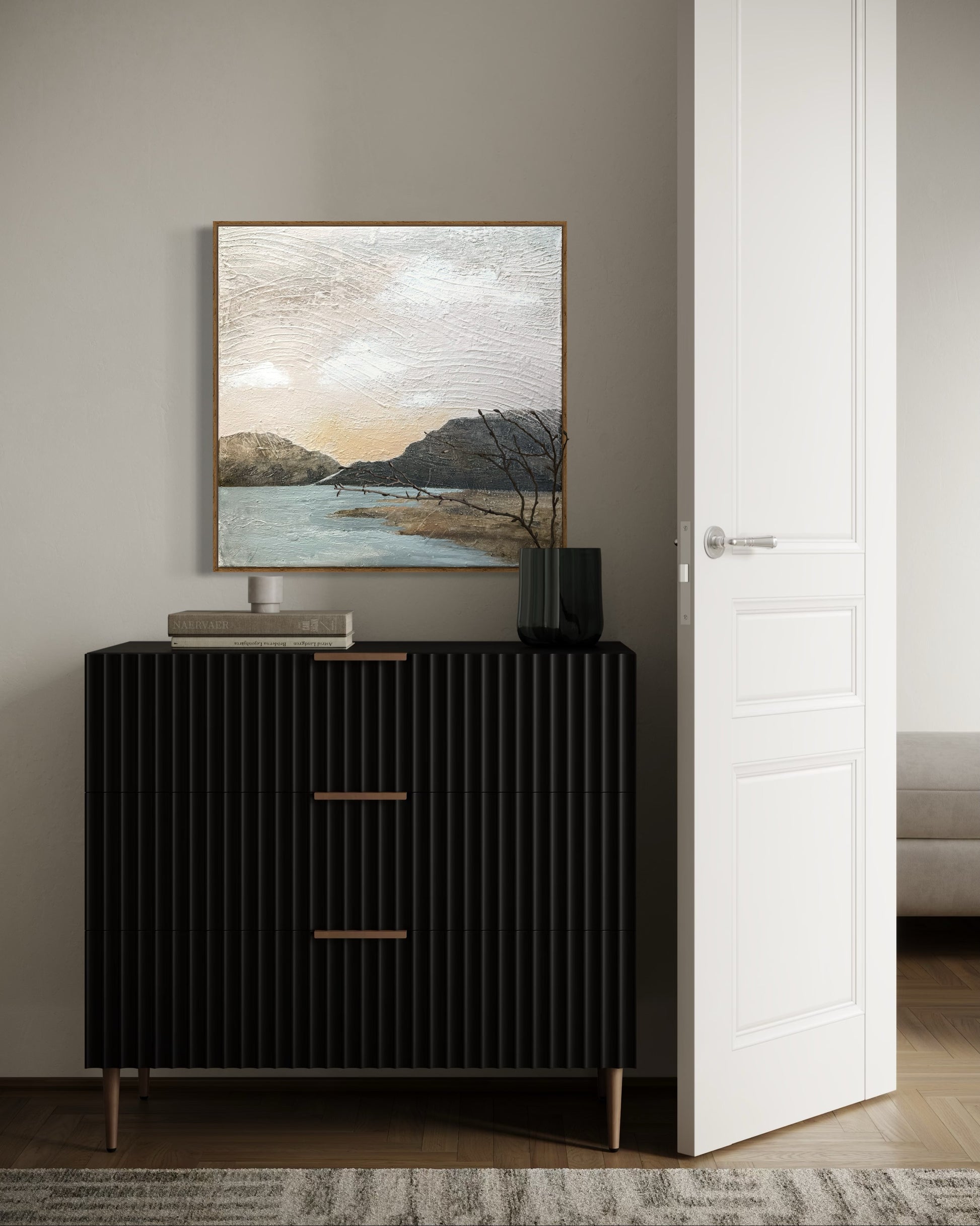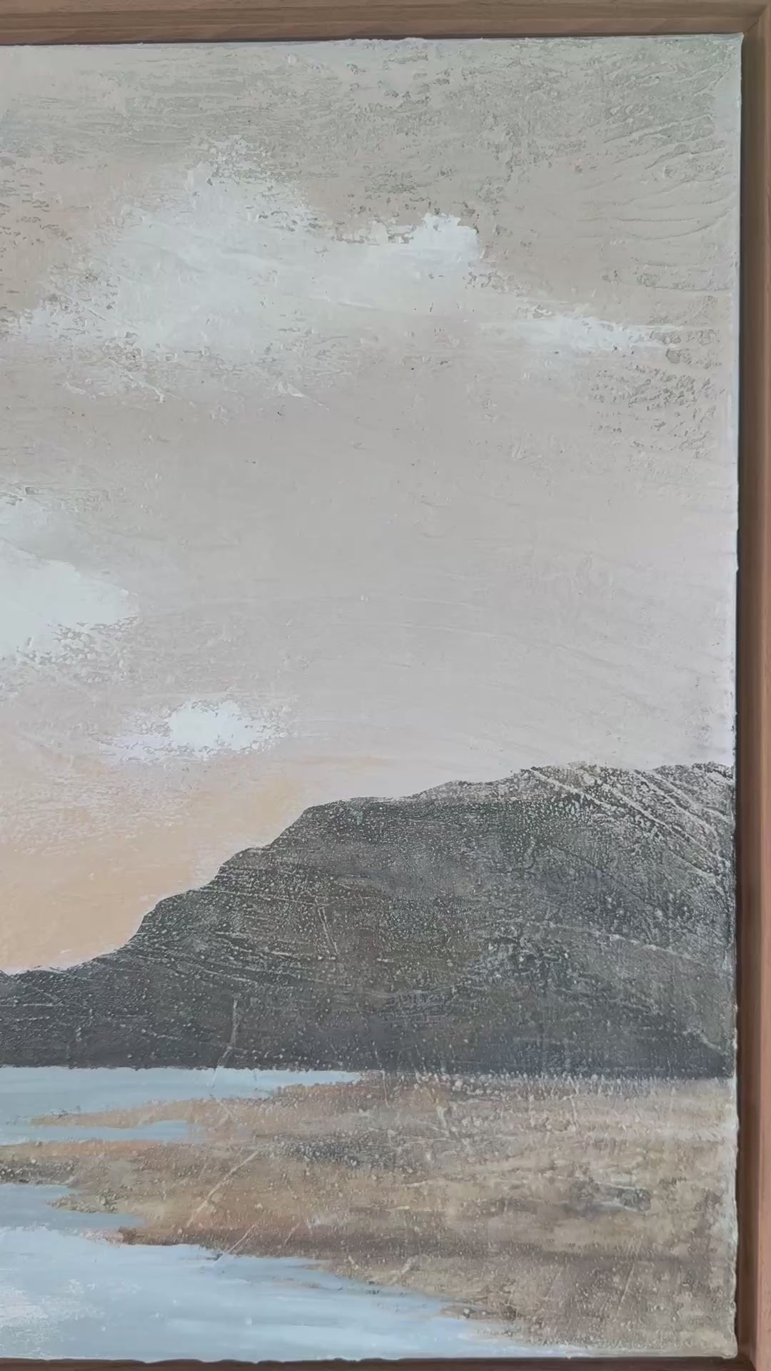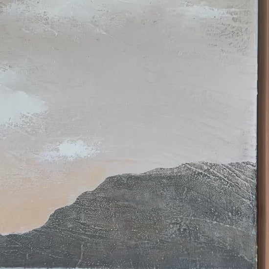Golden light spills over textured mountain peaks, capturing that quiet moment between night and day. This piece is calming and full of hope and promise.